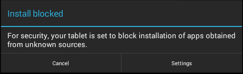 This is because, by default, apps from unknown sources (i.e. other than the Google Play store) are blocked by Android. The solution here is to click on Settings, which opens up the security settings dialog: