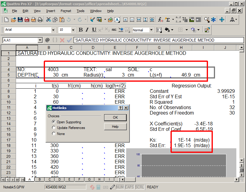 Things got really interesting when I tried opening this WQ2 spreadsheet. Upon opening, Quattro Pro comes up with a preview of the file, and a Hotlinks dialogue box:
