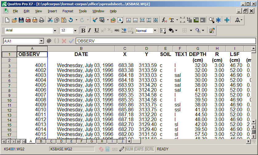 I also had another version of that spreadsheet in WQ2 (Quattro Pro for DOS version 5) format. Opening this file produced the following result: