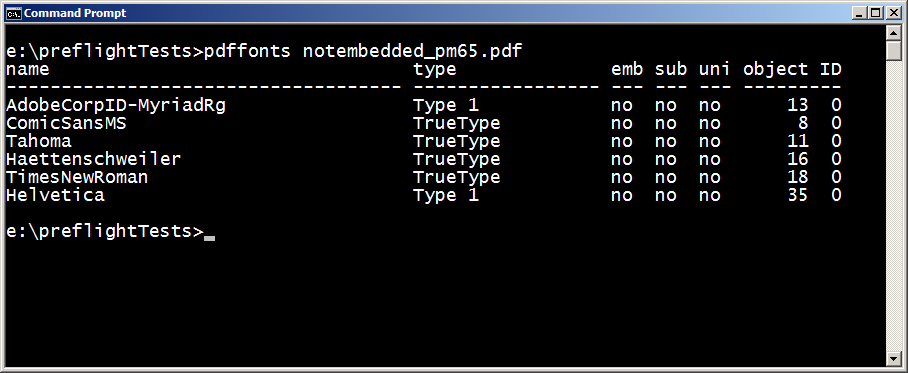 Similarly, the pdffonts tool that is part of xpdf is useful for checking whether fonts in a PDF are embedded:
