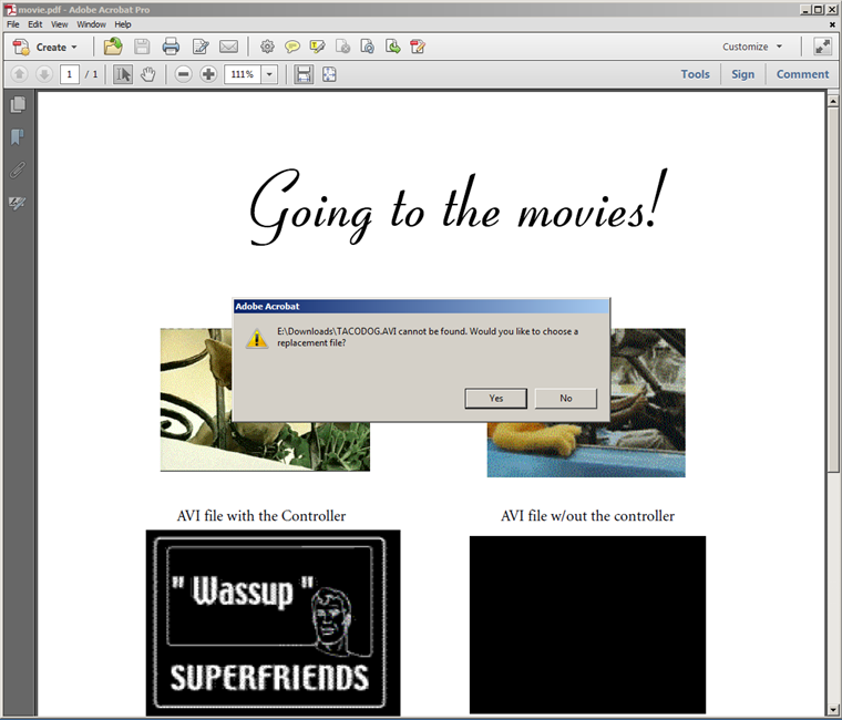 The file movie.pdf contains references to external multimedia files. If you click on any of them you get an error like this one: