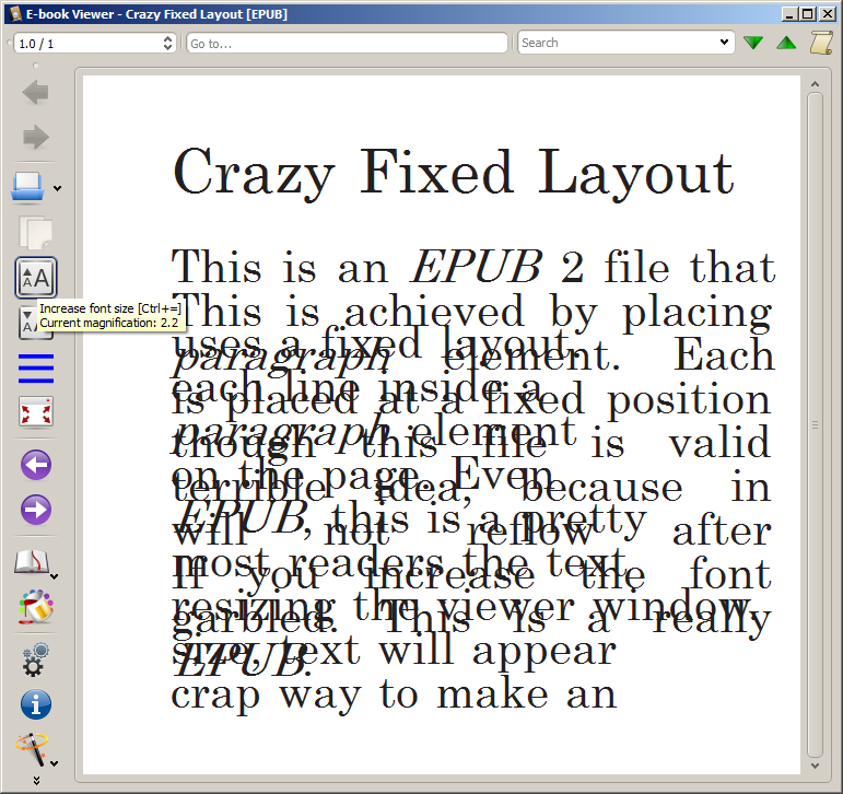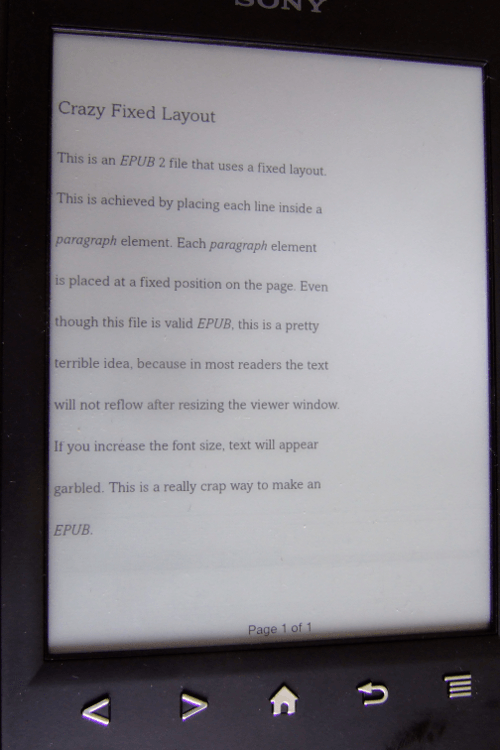 Each style definition specifies a line’s position on the canvas (left, top); moreover, these co-ordinates are defined as absolute positions. This means that each line is placed at a fixed position, regardless of whether this makes any sense given the actual dimensions of the viewer window (or device), or the user’s preferred font size. It seems that the intention of the producer of the original EPUB (from which I derived my example) was to create some sort of “fixed layout” document. However, this doesn’t make much sense for books with simple, text-only layouts (as in this case). Worse, depending on the viewing device and the user the file may be effectively inaccessible. For example, someone with a visual impairment may only be able to read an EPUB using very large font sizes, which in this case results in garbled text.