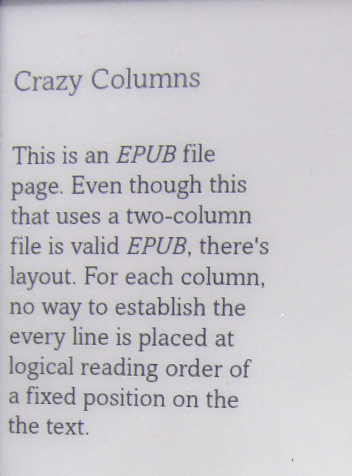 This is an EPUB filepage. Even though thisthat uses a two-columnfile is valid EPUB, there’slayout. For each column,no way to establish theevery line is placed atlogical reading order ofa fixed position on thethe text.