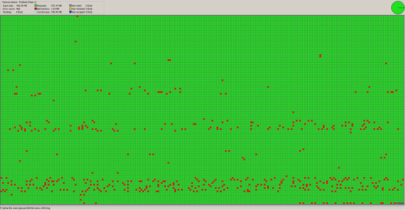For the third disc, 99.8% of the data could be recovered after four rounds with ddrescue with four optical drives. Below image shows a visualisation of the recovery process (made with ddrescueview):