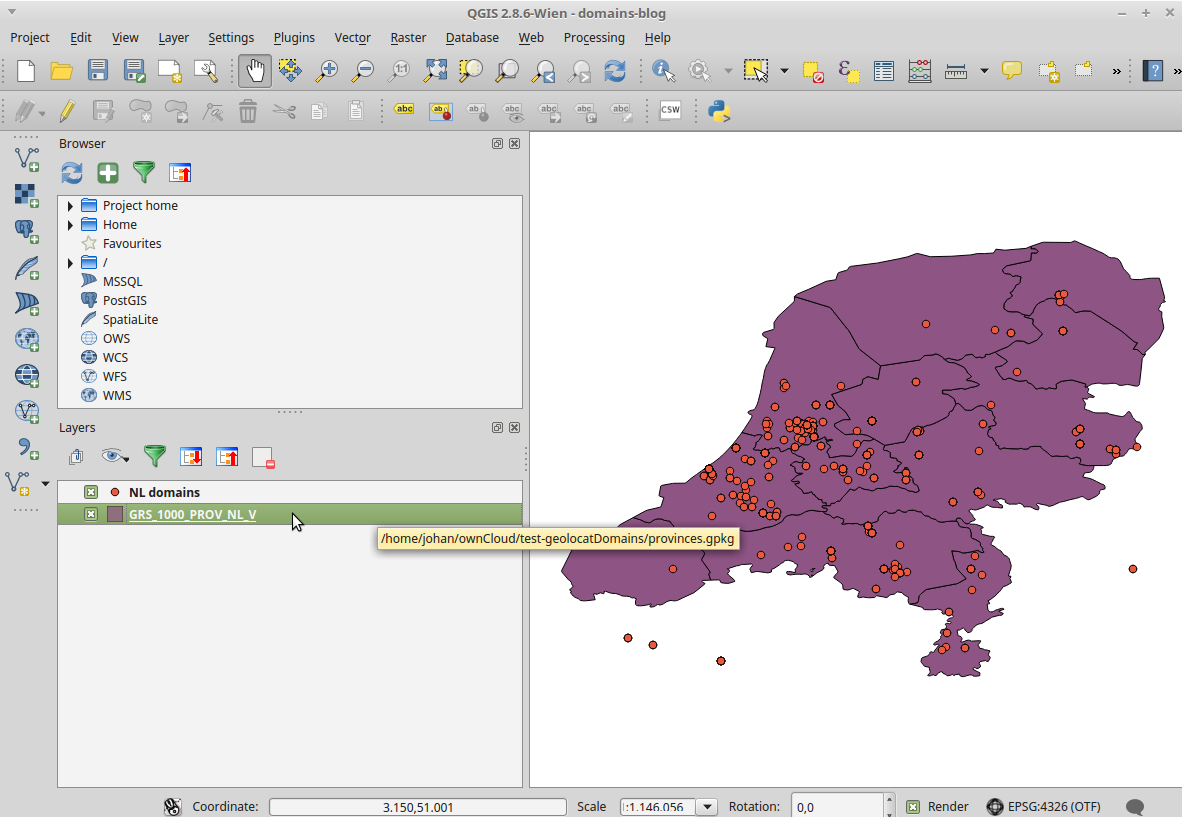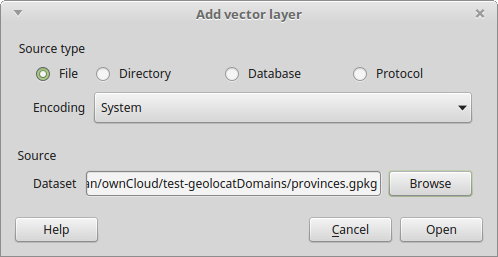 The objective of this exercise was to link web domains to provinces. A free, generalised vector layer of Dutch province boundaries is available here in a number of formats. I downloaded the GeoPackage version (which is essentially an SQLite database). After unzipping the file, go to the Layers menu and select Add Vector Layer ….: