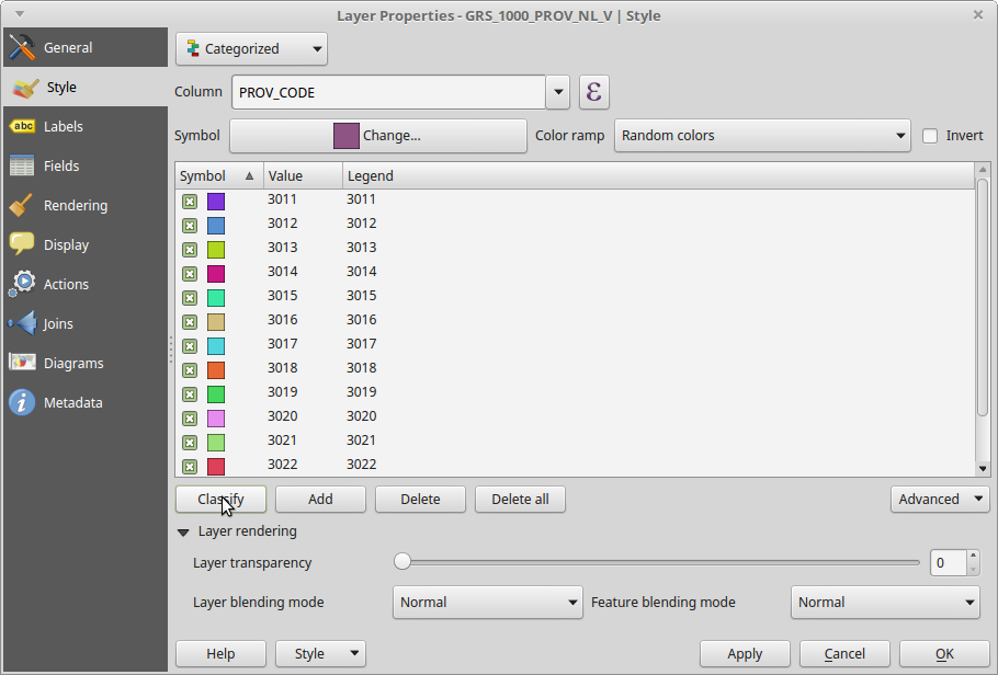 Now click on the Column drop-down menu, and select the column (attribute/field) that represents the map classes. In this case I used the PROV_CODE column. Next, click on the Classify button, which automatically assigns colours and legend values: