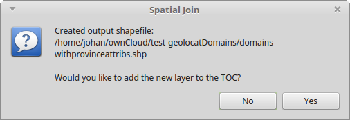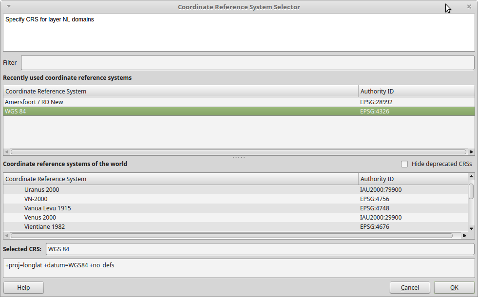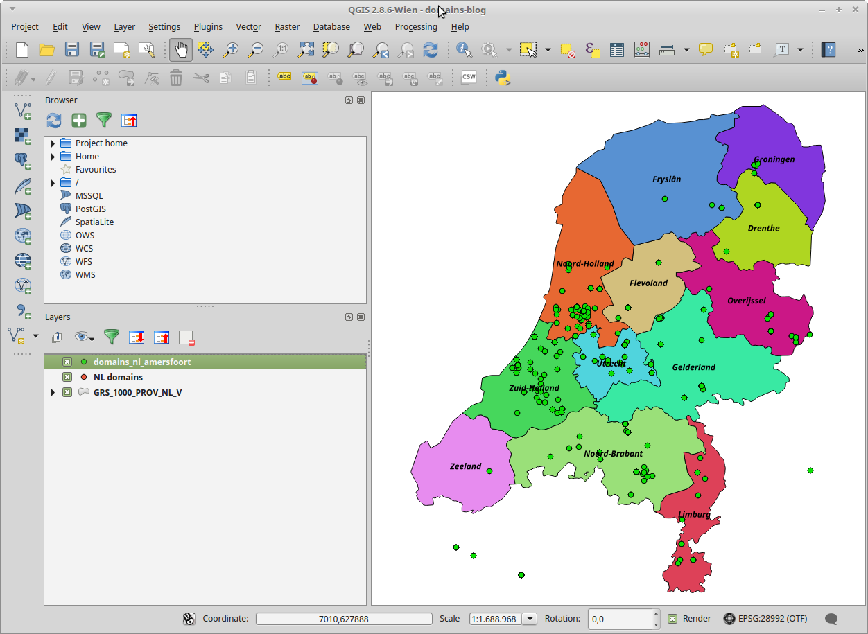 Having a pretty-looking map is nice, but in order to know which domains are hosted in which provinces we need to do some actual analysis. More specifically, for each web domain (point) we need to extract the corresponding attributes from the provinces vector layer. This is one of the most basic functionalities of QGIS. However, most of the analysis tools of QGIS require that all input layers have the same coordinate reference system. This is not the case here: the geographical coordinates of our point data are defined as latitude/longitude pairs, whereas the provinces vector layer uses the Amersfoort / RD New coordinate system (which is commonly used for maps of the Netherlands)!