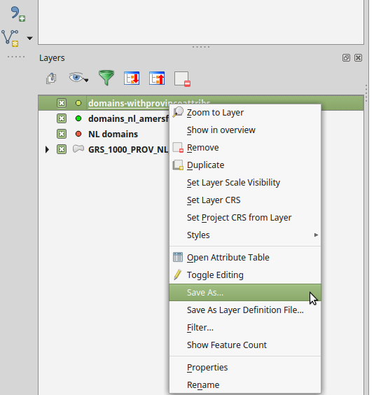 So, before we go any further we first need to transform our point data to the province layer’s coordinate system5. In the Layers panel, hover over the points layer and right-click Save As …: