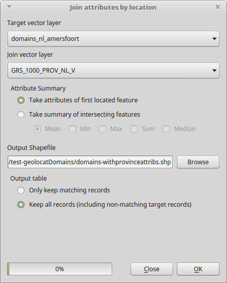 Next, set the Target vector layer to the layer with the (transformed) point data, and the Join vector layer to the provinces vector layer. Leave Attribute Summary to its default value (Take attributes of first located feature), specify an output file and set the Output table setting to Keep all records:
