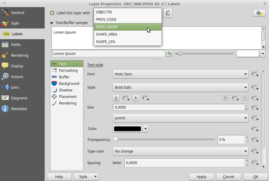 Let’s also add some labels. Click on Labels in the left pane, and tick the Label this layer with checkbox. Use the drop-down menu to select the column (attribute/field) that is used to assign the labels. In my case I used the PROV_NAAM (“province name”) column: