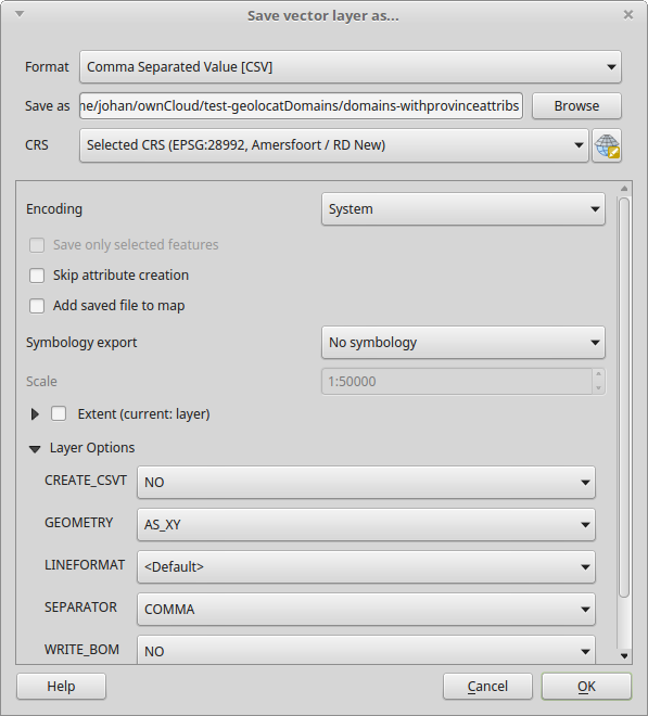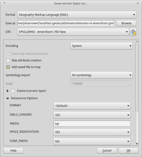 Set Format to Geography Markup Language [GML] and specify a file name and location. In the CRS dropdown menu, select the coordinate system of the provinces layer (here: Amersfoort / RD New). Leave all other options to their default values: