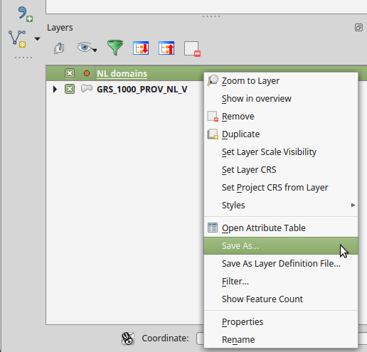 As a final step we export the layer that we created in the previous step to a delimited text file. In the Layers panel, hover over the new layer and right-click Save As …: