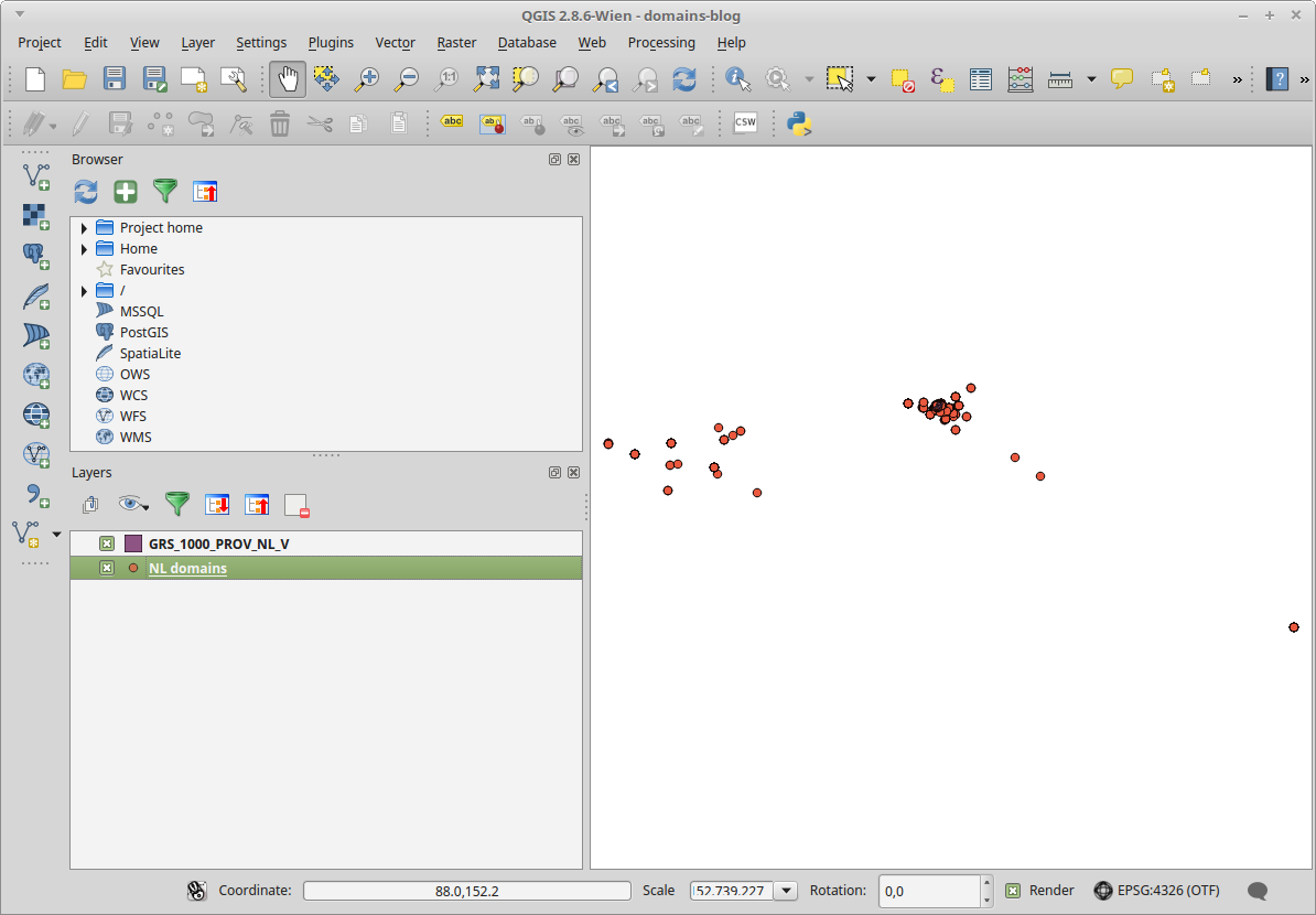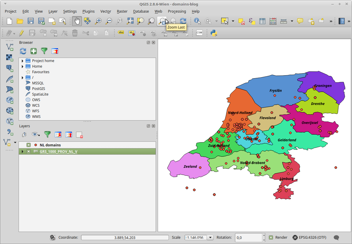After I ran the script on the list of Dutch domain names, I noticed that city name values were often missing. However, latitude and longitude were always available (provided that a domain can be mapped to an IP address), so that’s what we’ll work with here. In order to answer the question that started this whole exercise (“which domains are hosted in the province of Friesland”), we need to do some additional spatial analysis. Geographic Information Systems (GIS) are a class of software that are specifically suited to this. So, I downloaded and installed the free and open-source QGIS software.