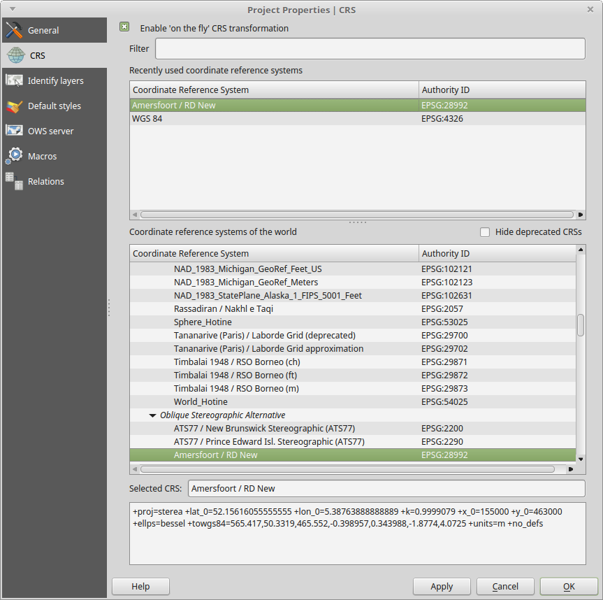 While at it, let’s also change the project coordinate system to Amersfoort / RD New6: in the Project menu, click on Project Properties …. In the dialog that now appears, click on Amersfoort / RD New in the Recently used coordinate reference systems pane, and then press Apply: