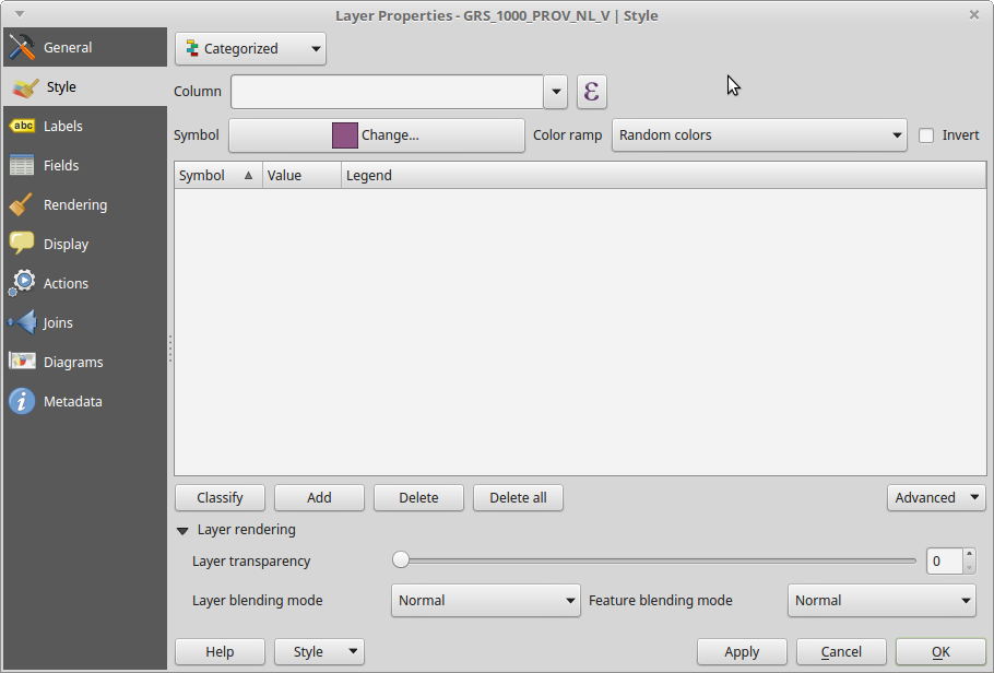 In the dialog that appears, first click on Style in the left pane. Click on Single Symbol in the drop-down menu, change it to Categorized, and then click on the Apply button: