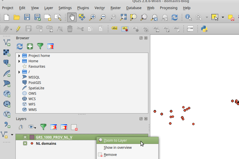 Note that the provinces layer is visible as a tiny purple blob at the center of the image! The reason for this is that the default zoom level of the map view covers the whole geographical extent of the domain points data, which apparently includes locations all over the world! So let’s change that. In the Layers panel, hover over the provinces layer, right-click and then select Zoom to Layer: